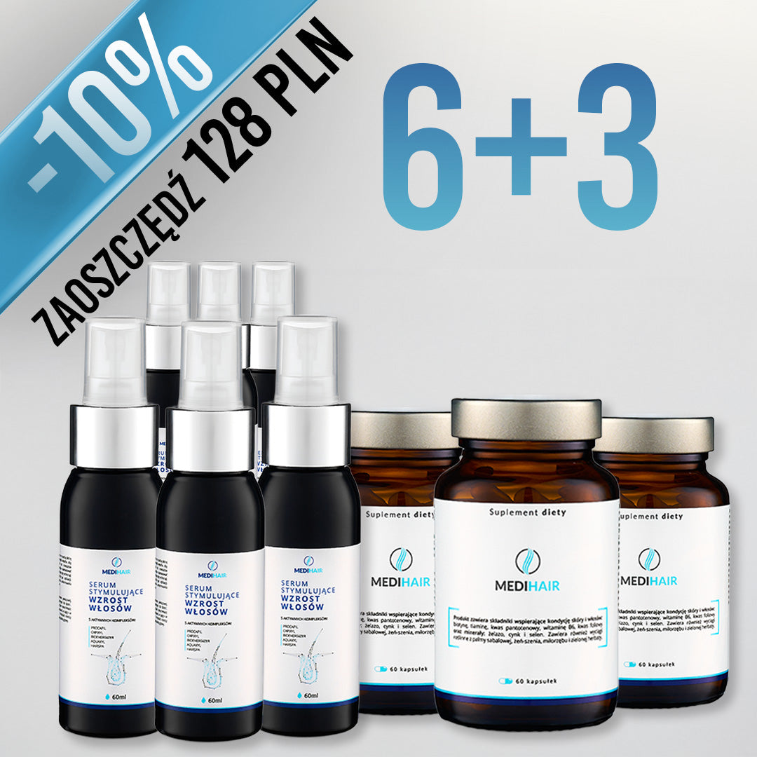 Połączenie Serum Stymulującego Wzrost Włosów i Suplementu Diety MediHair to idealne rozwiązanie dla osób pragnących zadbać o swoje włosy zarówno od zewnątrz, jak i od wewnątrz. Kupując w pakiecie na 6 miesięcy, oszczędzasz jeszcze więcej!
